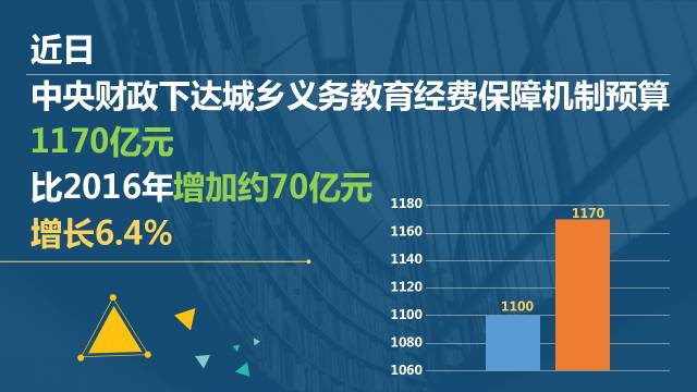 为确保国务院确定第二步改革目标如期实现,近日,中央财政下达城乡义务教育经费保障机制预算1170亿元,比2016年增加约70亿元,增长6.4%。