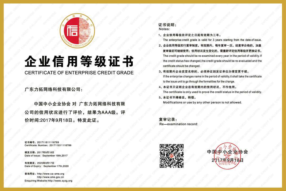 企业信用评价AAA级信用企业,经过对广东力拓科技的信息备案、资质认证、信用管理、社会信用记录、税务登记等众多指标进行了严格、全面的分析和审核。我司凭借良好的品牌认知度和社会美誉度,最终获得信用等级最高的“企业信用评价AAA级信用企业”荣誉称号。